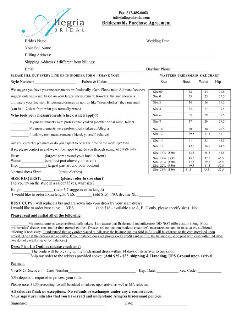 Fax: 6174890063 info allegriabridal. Bridesmaids Purchase AgreementBride's Name Wedding Date Your Full Name Billing Address: Shipping Address (if different from billing): Email Daytime Phone PLEASE