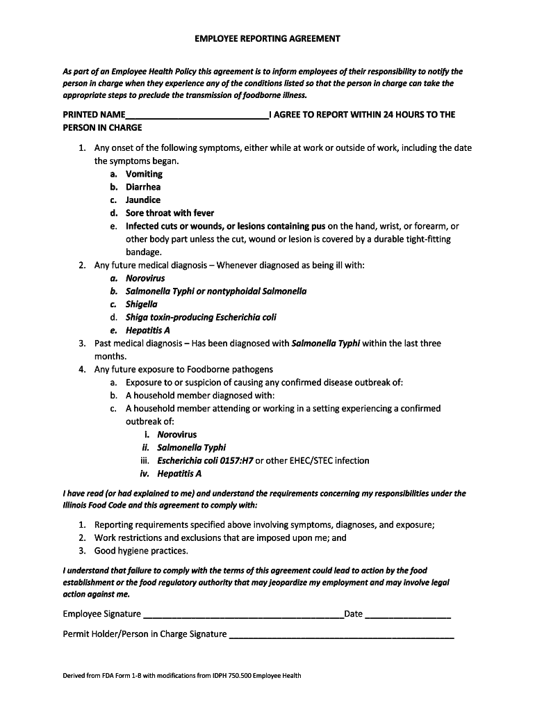EMPLOYEE REPORTING AGREEMENT As part of an Employee Health Policy this agreement is to inform employees of their responsibility to notify the person in charge when they experience any of the conditions