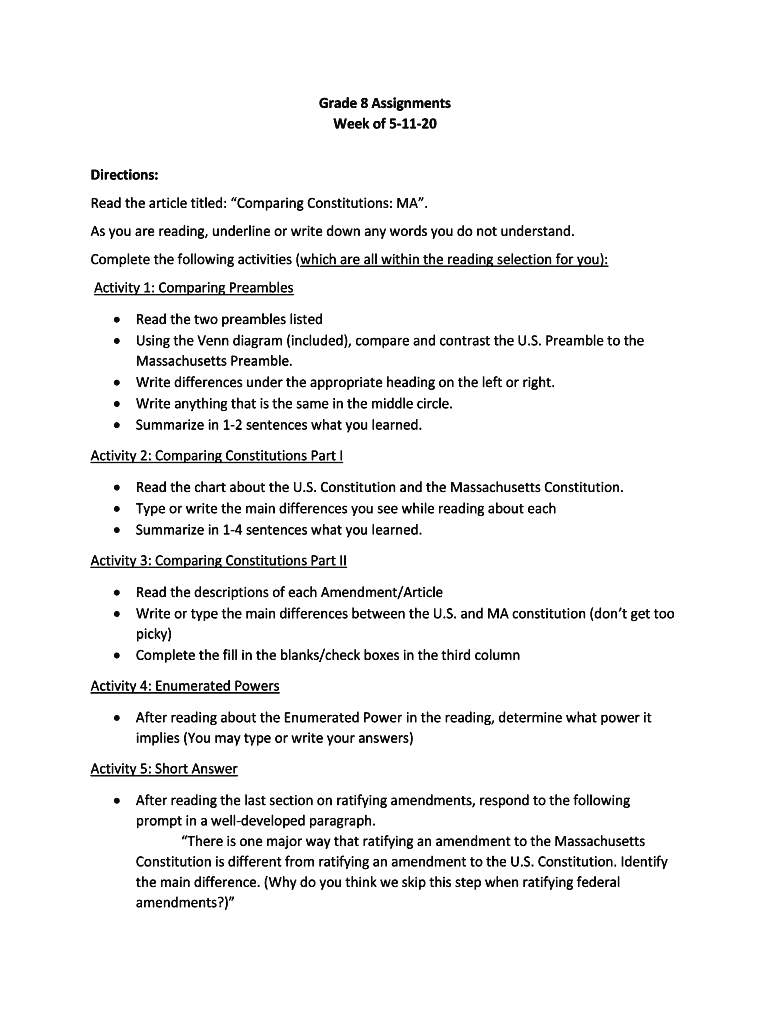 Grade 8 Assignments Week of 51120 Directions: Read the article titled: Comparing Constitutions: MA. As you are reading, underline or write down any words you do not understand. Complete the following