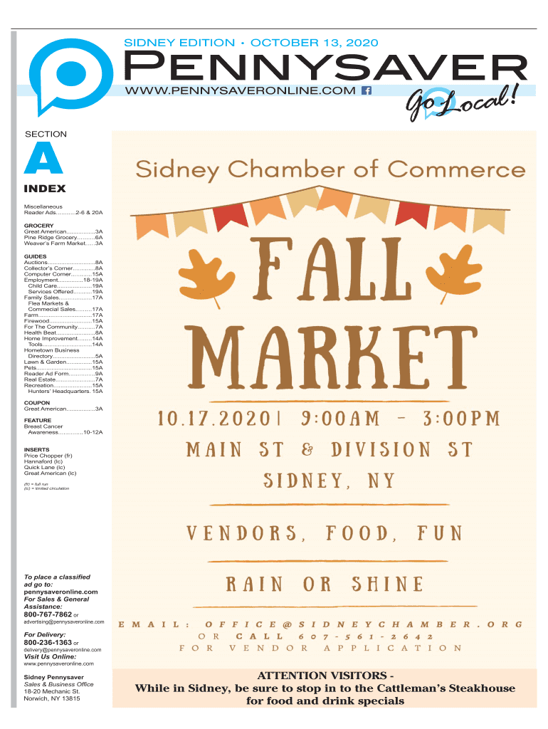SIDNEY EDITION OCTOBER 13, 2020Pennysaver WWW.PENNYSAVERONLINE.COMGoLocal!SECTION INDEX Miscellaneous Reader Ads...........26 & 20A GROCERY Great American.................3A Pine Ridge Grocery..........6A