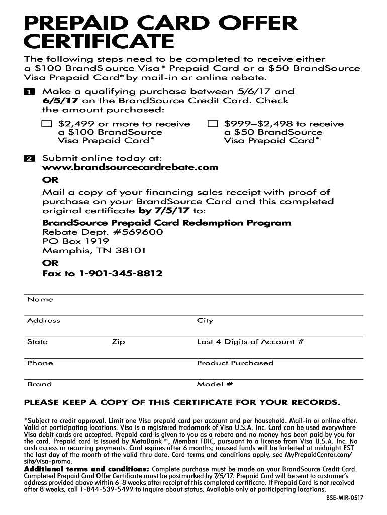 PREPAID CARD OFFER CERTIFICATE The following steps need to be completed to receive either a $100 Brand Source Visa Prepaid Card or a $50 Crowdsource Visa Prepaid Card* by mailing or online rebate.
