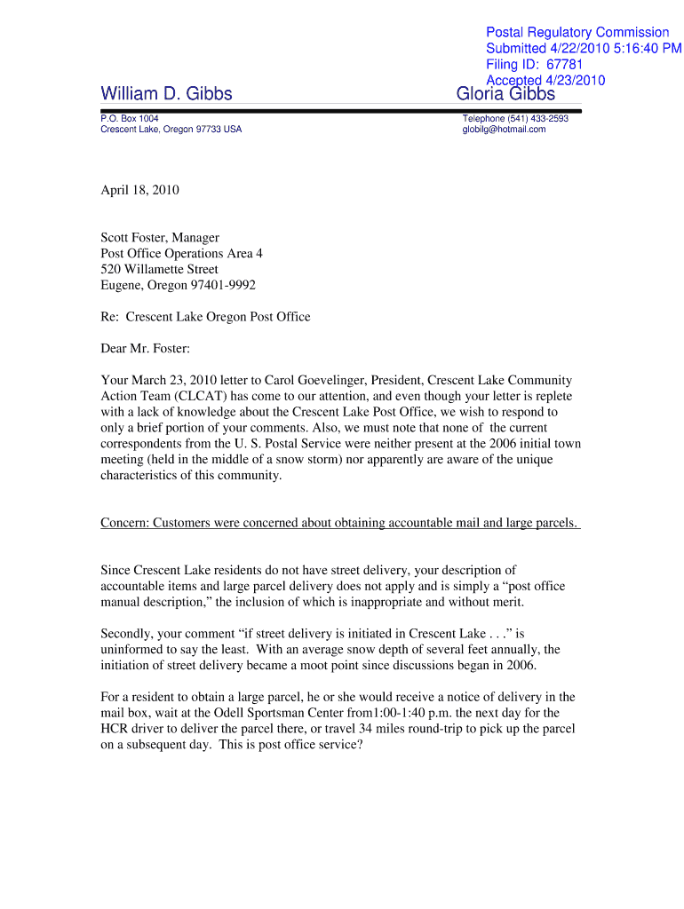 Crescent Lake, Oregon 97733 Postal Regulatory Commission
