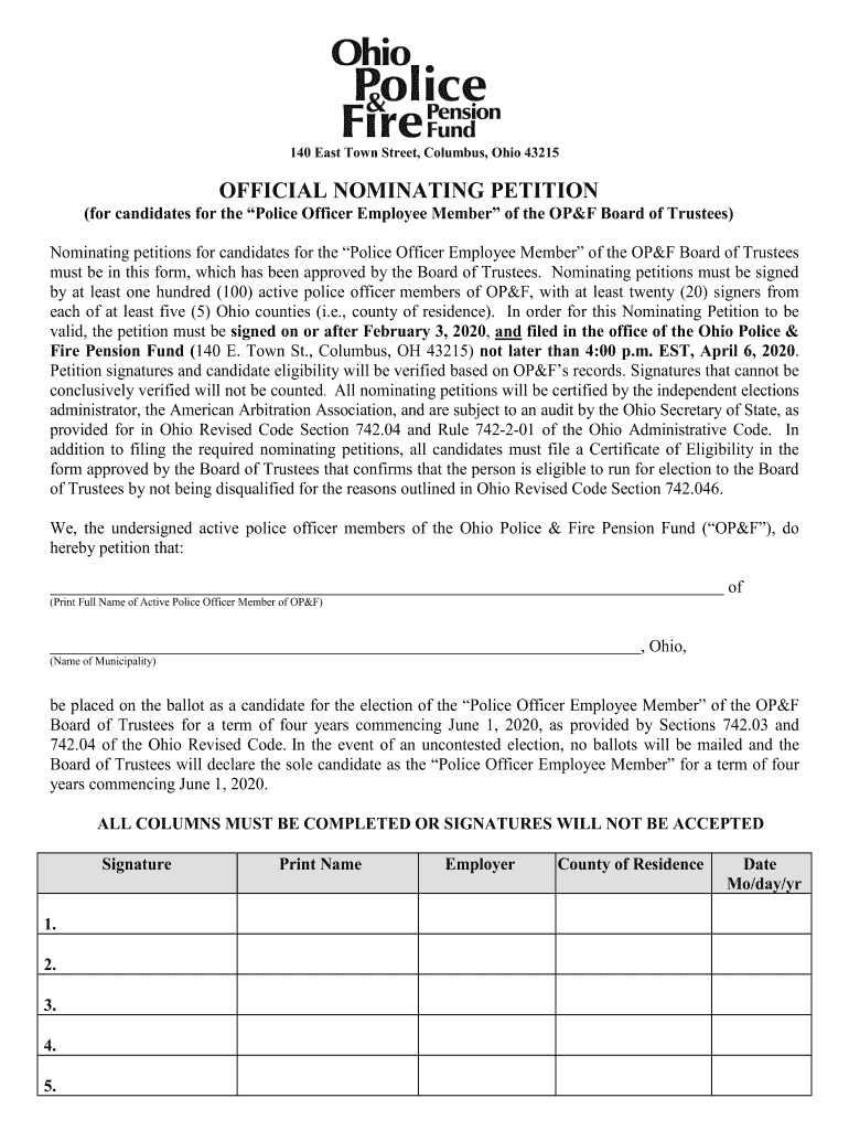 140 East Town Street, Columbus, Ohio 43215OFFICIAL NOMINATING PETITION(for candidates for the Police Officer Employee Member of the OF Board of Trustees) Nominating petitions for candidates for the