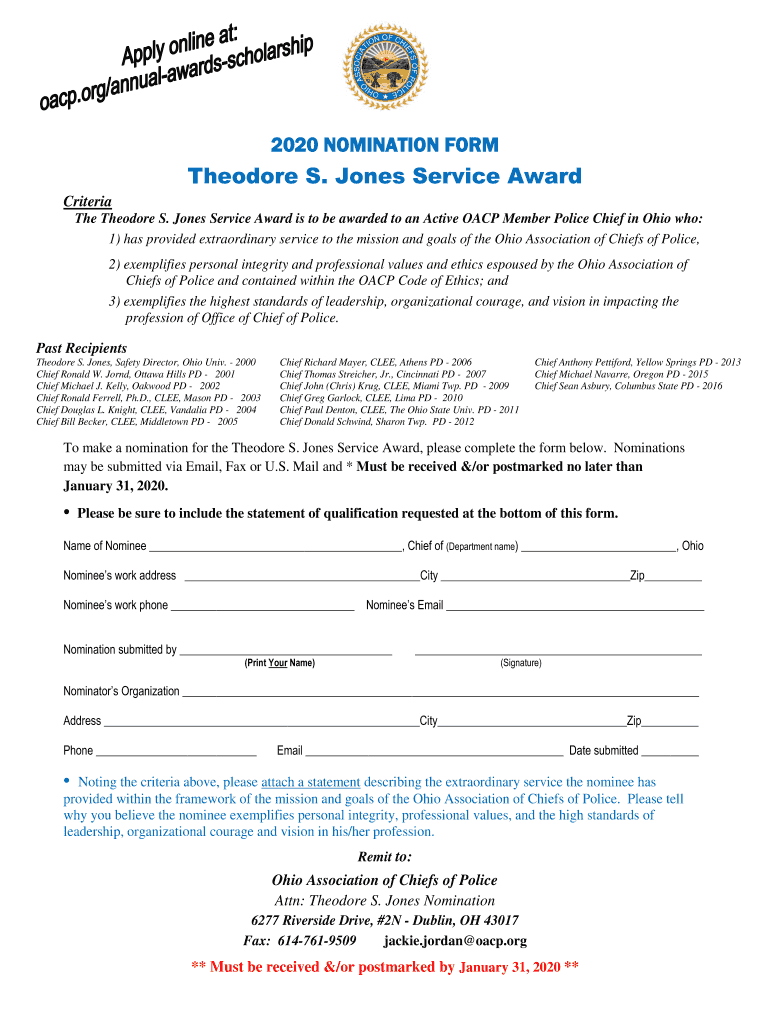 The Theodore S. Jones Service Award is to be awarded to an Active OAP Member Police Chief in Ohio who: