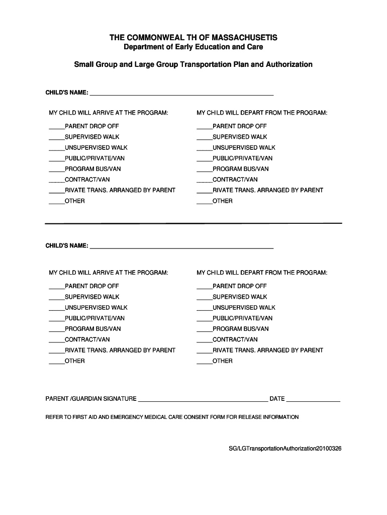THE COMMONWEAL TH OF MASSACHUSETTS Department of Early Education and Care Small Group and Large Group Transportation Plan and AuthorizationCHILD IS NAME: MY CHILD WILL Arrive in AT THE PROGRAM:MY