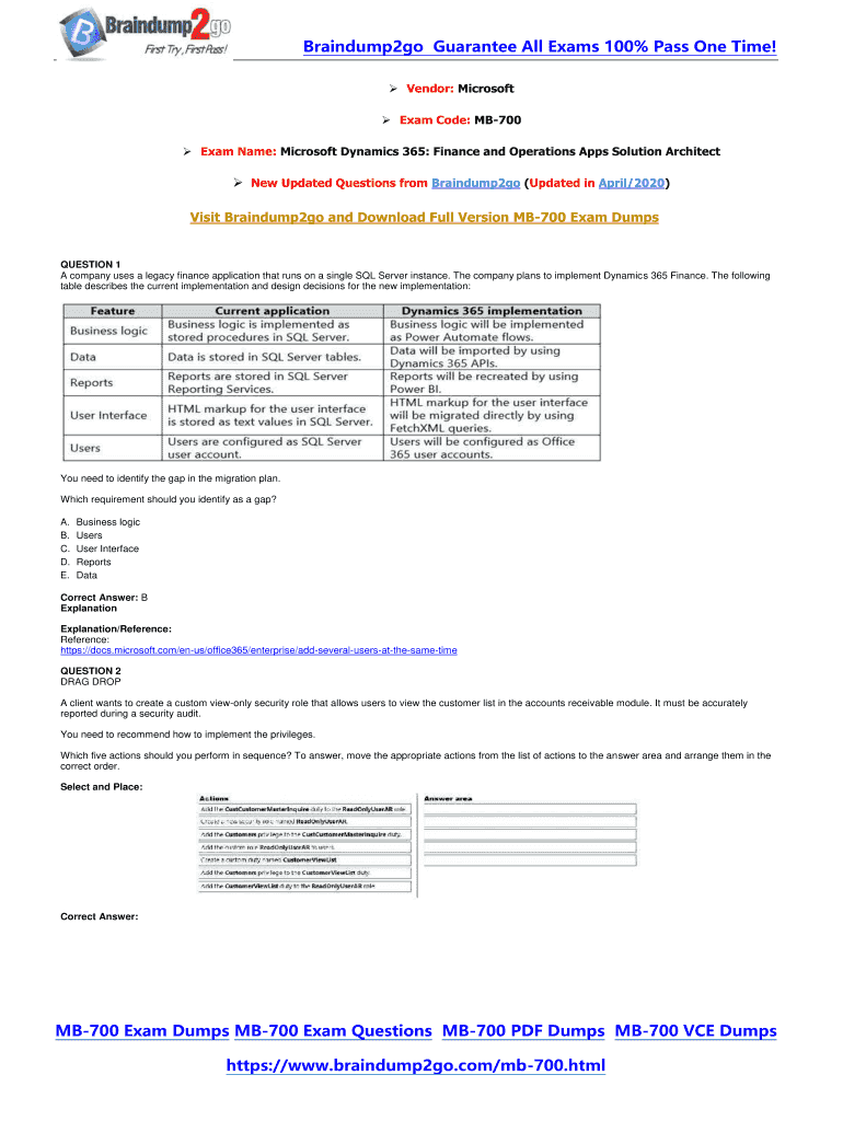 Braindump2go Guarantee All Exams 100% Pass One Time! Vendor: Microsoft Exam Code: MB700 Exam Name: Microsoft Dynamics 365: Finance and Operations Apps Solution Architect New Updated Questions from