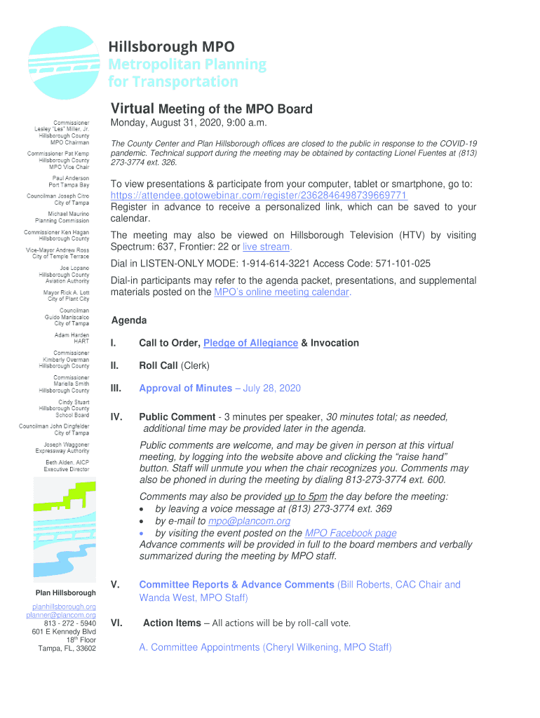 Virtual Meeting of the MPH Board Monday, August 31, 2020, 9:00 a.m. The County Center and Plan Hillsborough offices are closed to the public in response to the COVID-19 pandemic. Technical support