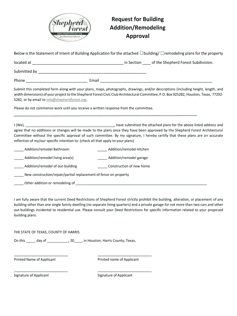 Request for Building Addition/Remodeling Approval Below is the Statement of Intent of Building Application for the attached building/ remodeling plans for the property located at in Section of the