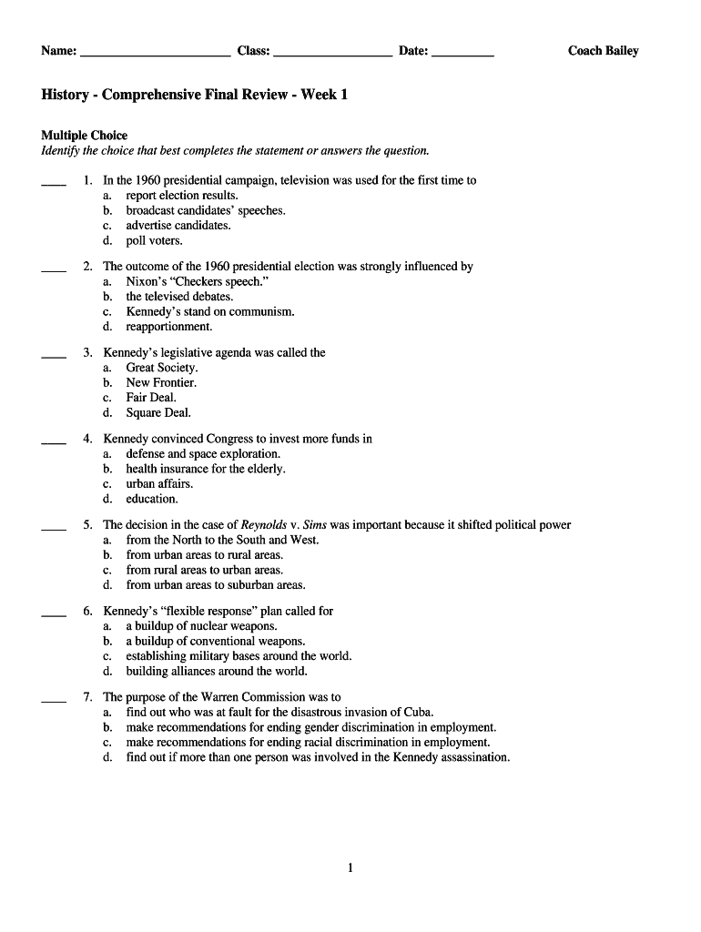 Name: Class: Date: Coach BaileyHistory Comprehensive Final Review Week 1 Multiple Choice Identify the choice that best completes the statement or answers the question. 1. In the 1960 presidential