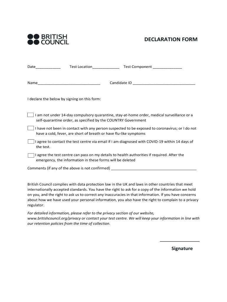 DECLARATION Format Test Location Test Component Name Candidate ID I declare the below by signing on this form:I am not under 14day compulsory quarantine, stayathome order, medical surveillance or