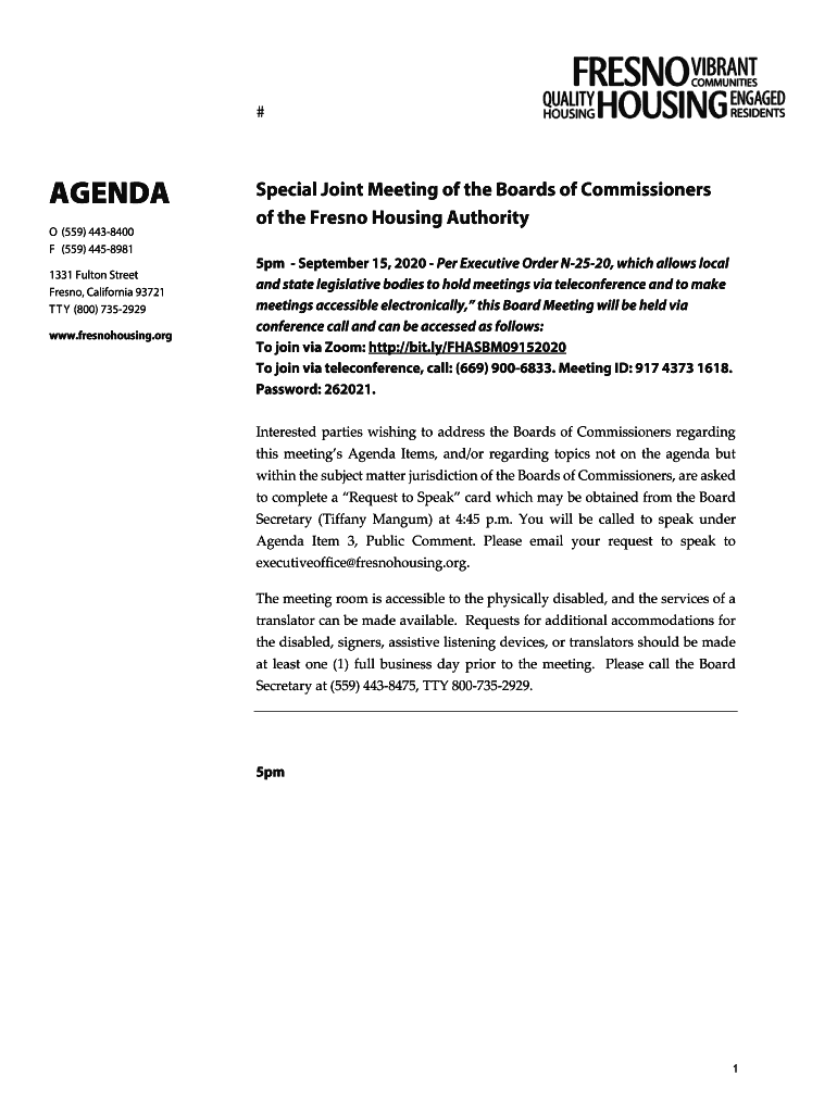 AGENDA O (559) 4438400 F (559) 4458981 1331 Fulton Street Fresno, California 93721 T Y (800) 7352929 www.fresnohousing.orgSpecial Joint Meeting of the Boards of Commissioners of the Fresno Housing