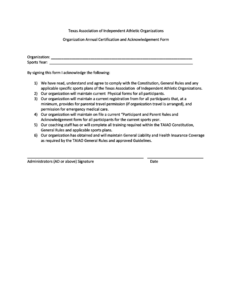 TexasAssociationofIndependentAthleticOrganizations OrganizationAnnualCertificationandAcknowledgementForm Organization: Sportswear: BysigningthisformIacknowledgethefollowing: 1) Wavered, understandandagreetocomplywiththeConstitution,