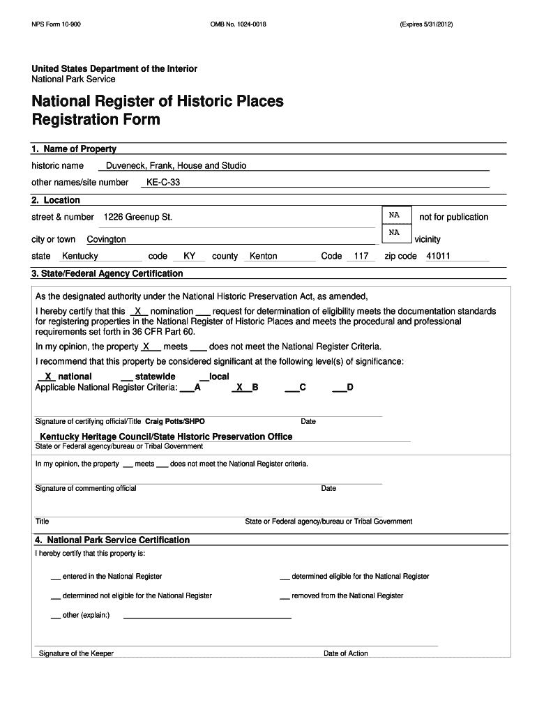 NPS Form 10900OMB No. 10240018(Expires 5/31/2012)United States Department of the Interior National Park ServiceNational Register of Historic Places Registration Form 1. Name of Property historic nameDuveneck,