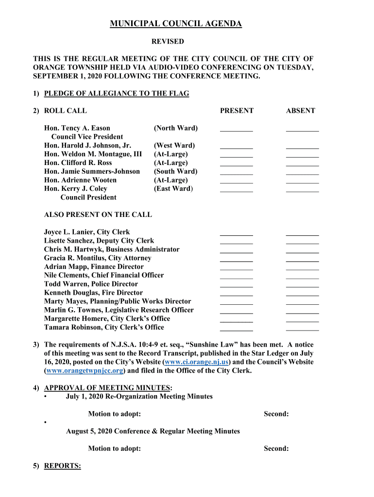 MUNICIPAL COUNCIL AGENDA REVISED THIS IS THE REGULAR MEETING OF THE CITY COUNCIL OF THE CITY OF ORANGE TOWNSHIP HELD VIA AUDIOVIDEO CONFERENCING ON TUESDAY, SEPTEMBER 1, 2020, FOLLOWING THE CONFERENCE