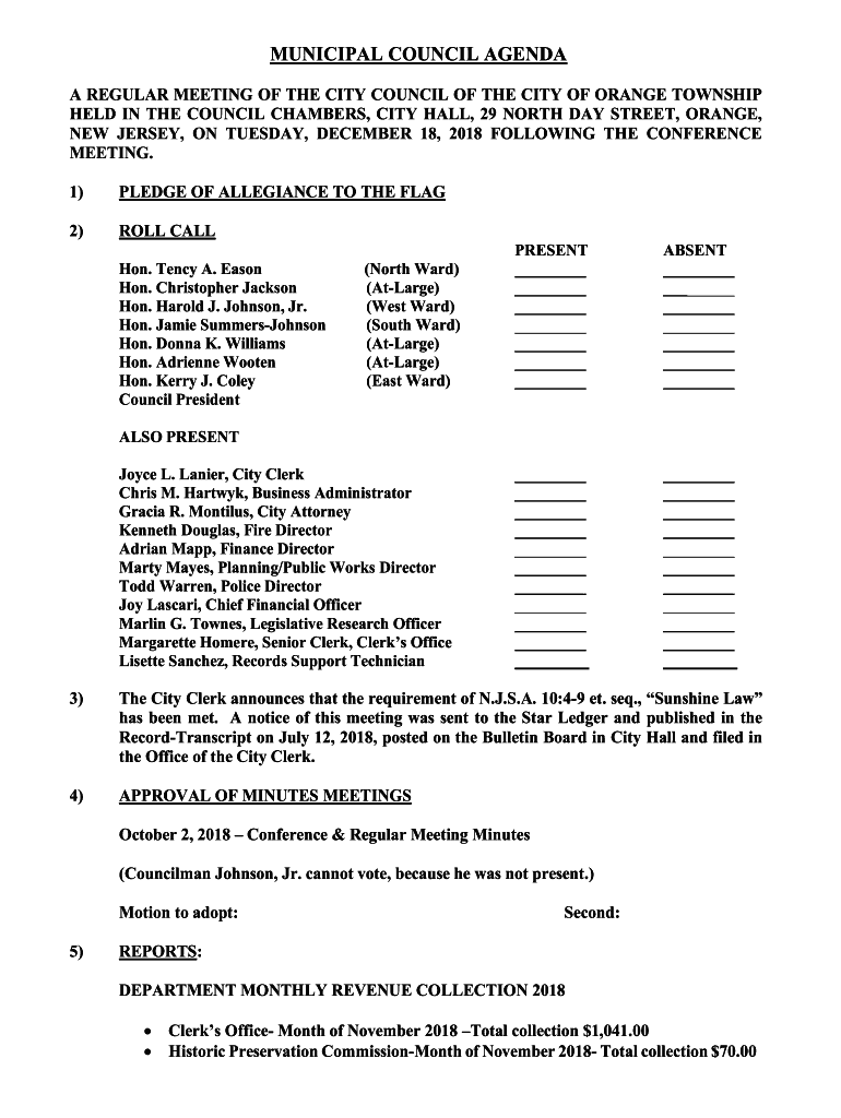A REGULAR MEETING OF THE CITY COUNCIL OF THE CITY OF ORANGE TOWNSHIP