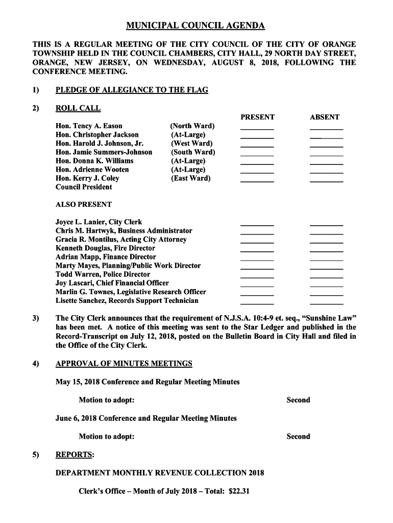 Get the free ORANGE, NEW JERSEY, ON WEDNESDAY, AUGUST 8, 2018, FOLLOWING THE