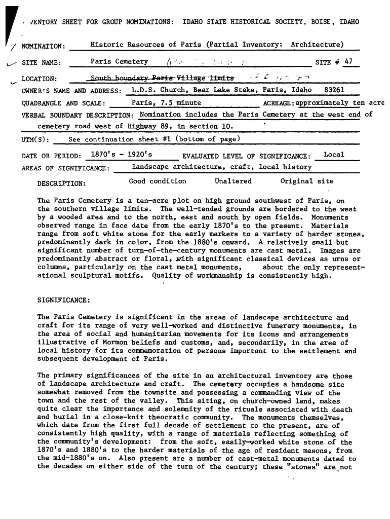 /ENTRY SHEET FOR GROUP NOMINATIONS:IDAHO STATE HISTORICAL SOCIETY, BOISE, IDAHO/ NOMINATION: Historic Resources of Paris (Partial Inventory: SITE NAME:Paris CemeteryLOCATION://V×./ ;. Lymph boundary