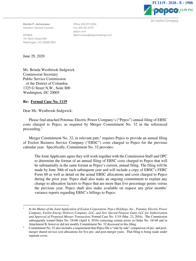 FC1119 2020 E 1908 RECEIVED 2020 JUN 29 12:59 PM Dennis P. Juneau Assistant General Counsel EP9628 701 Ninth Street NW Washington, DC 200680001Office 202.872.3034 Fax 202.331.6767 pepco.com djamouneau