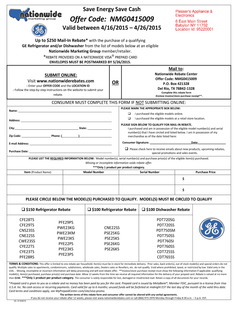 Save Energy Save Cashless's Appliance & Electronics 6 East Main Street Babylon NY 11702 Location I'd: 95220001Offer Code: NMG0415009 Valid between 4/16/2015 4/26/2015 Up to $250 Mailing Rebate* with