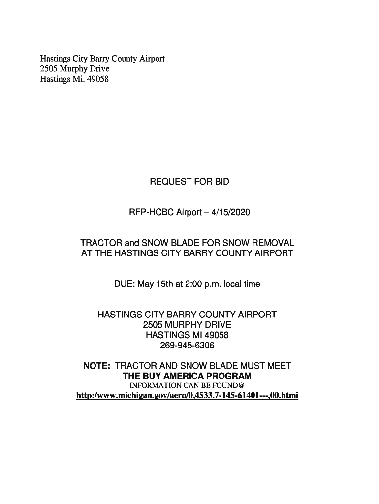 Hastings City Barry County Airport 2505 Murphy Drive Hastings Mi. 49058REQUEST FOR BID RFPHCBC Airport 4/15/2020TRACTOR and SNOW BLADE FOR SNOW REMOVAL AT THE HASTINGS CITY BARRY COUNTY AIRPORT: May
