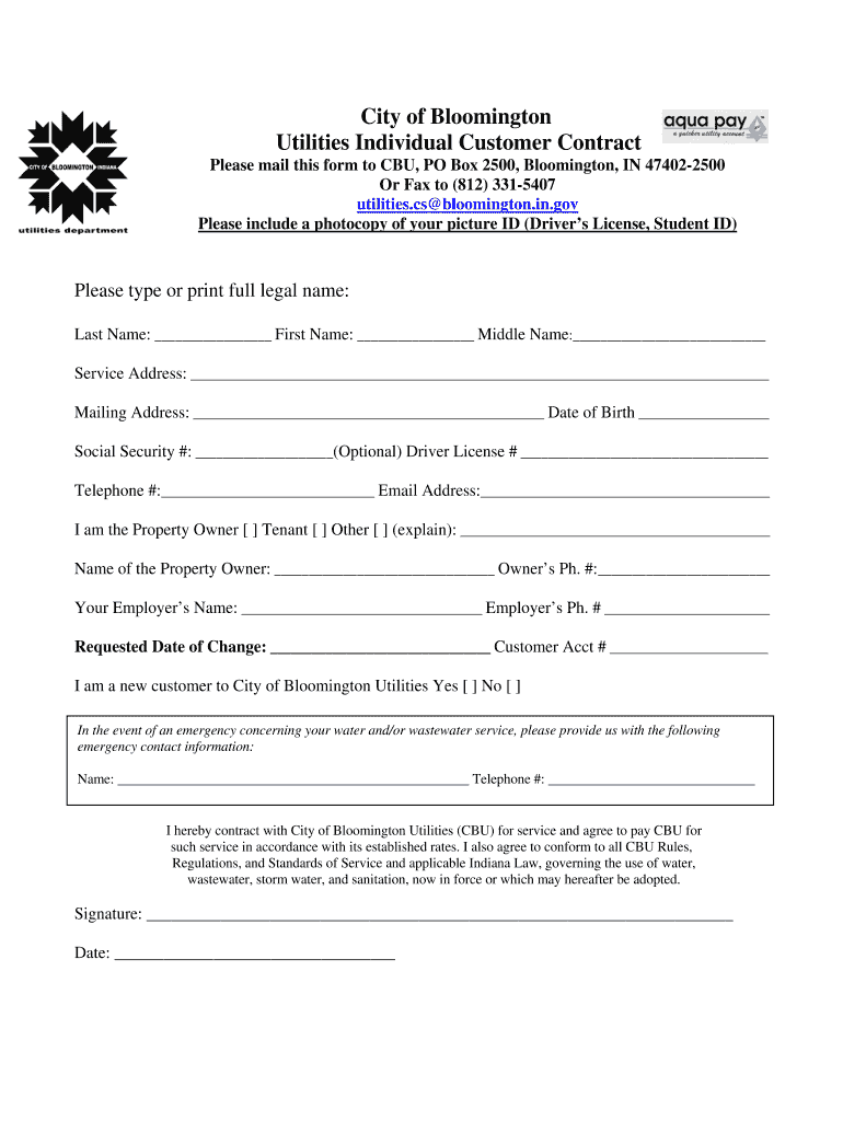 City of Bloomington Utilities Individual Customer Contract Please mail this form to CBU, PO Box 2500, Bloomington, IN 474022500 Or Fax to (812) 3315407 utilities.cs Bloomington.in.gov Please include