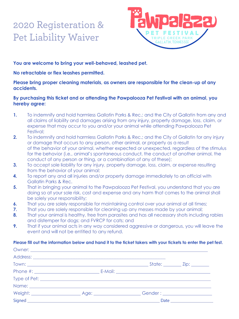 Any individual or pet owner who plans to attend or participate in Pawpalooza event needs to fill out the pet waiver.