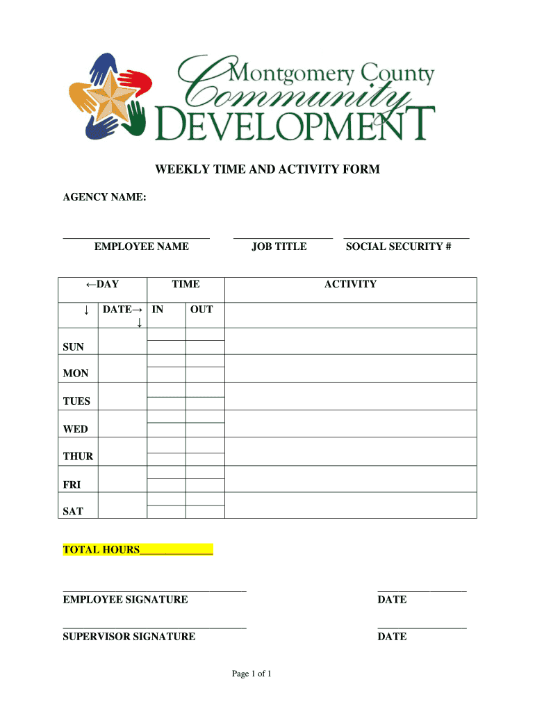 To complete the Weekly Time and Activity Form, you'll need your name, job title, social security number, and daily records of activities and hours worked for the week.