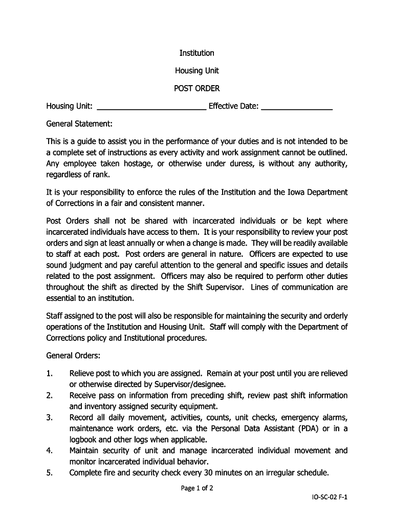 Institution Housing Unit POST ORDER Housing Unit: Effective Date: General Statement: This is a guide to assist you in the performance of your duties and is not intended to be a complete set of instructions