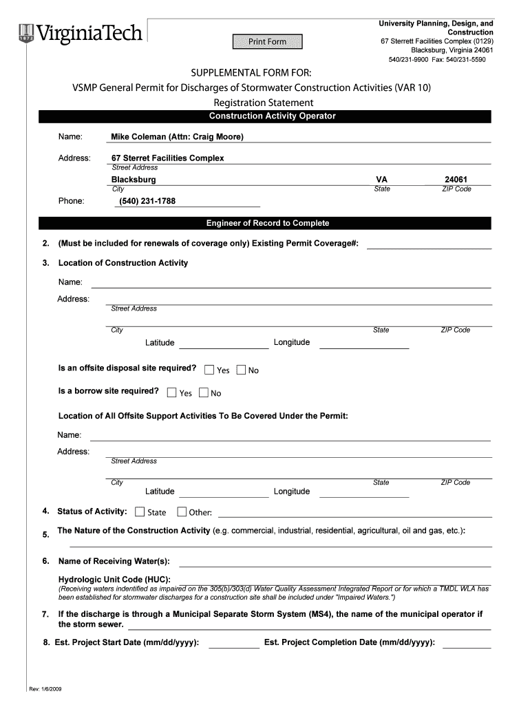 Print Form University Planning, Design, and Construction 67 Sterrett Facilities Complex (0129) Blacksburg, Virginia 24061 540/231-9900 Fax: 540/231-5590 SUPPLEMENTAL FORM FOR: VAMP General Permits