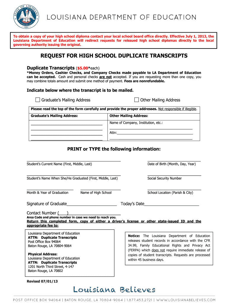 Before completing the Louisiana High School Duplicate Transcripts Request form, graduates must prepare specific information. Key details include: