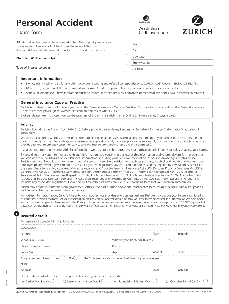 Personal Accident Claim form All relevant sections are to be answered in full. Please print your answers. The company does not admit liability by the issue of this form. It is issued to enable the