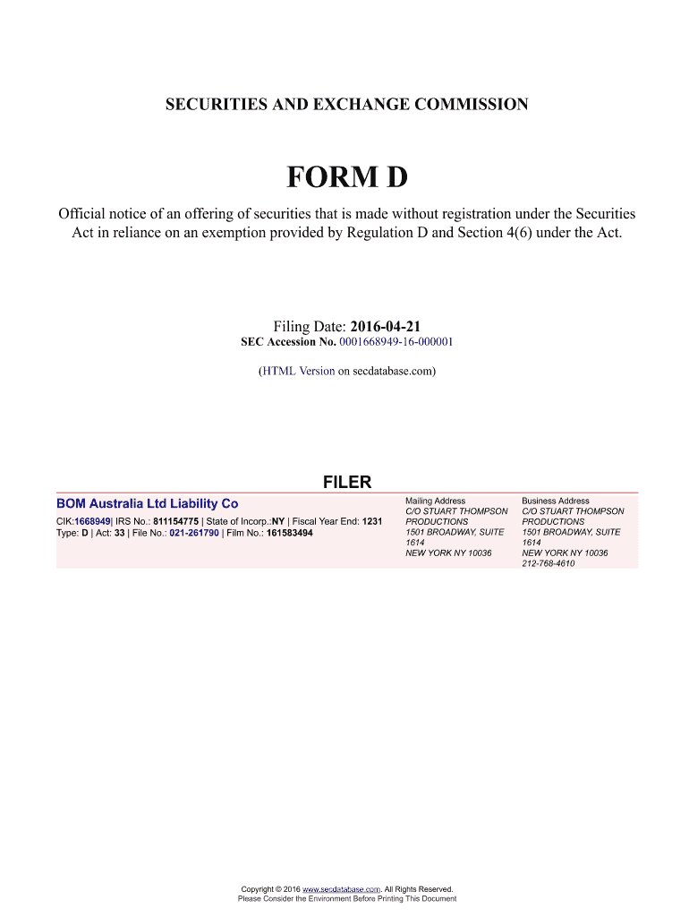 Get the free BOM Australia Ltd Liability Co Form D Filed 2016-04-21. Accession Number