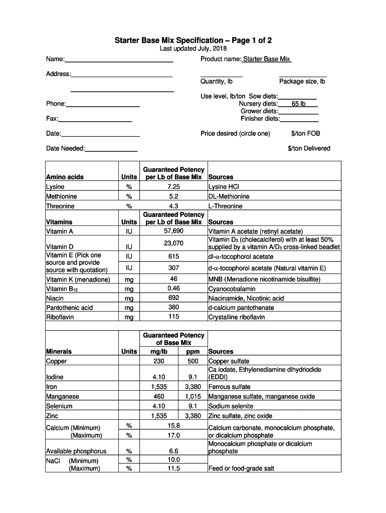 Starter Base Mix Specification Page 1 of 2 Last updated July 2018 Product name: Starter Base Misname: Address:Quantity, package size, fax:Use level, lb/ton Sow diets: Nursery diets: Grower diets: