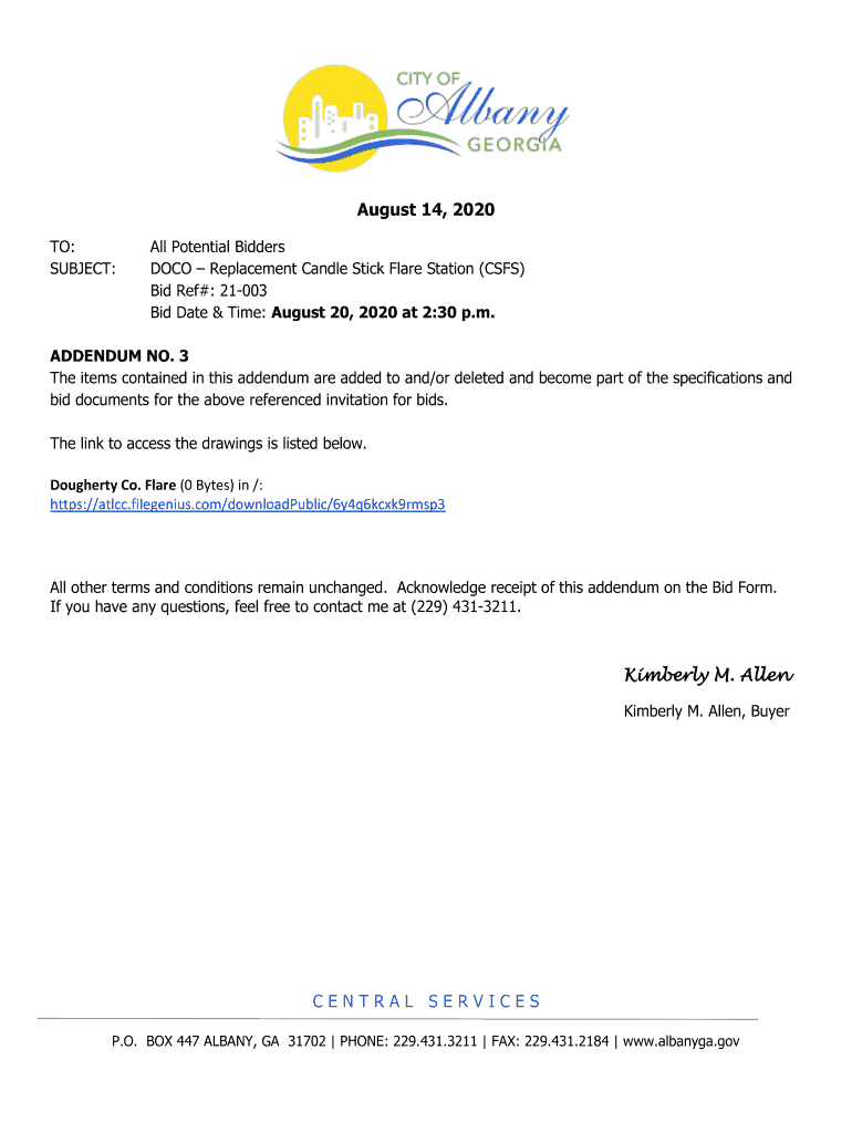 August 14, 2020, TO: SUBJECT:All Potential Bidders DOCK Replacement Candle Stick Flare Station (CSS) Bid Ref#: 21003 Bid Date & Time: August 20, 2020, at 2:30 p.m.ADDENDUM NO. 3 The items contained