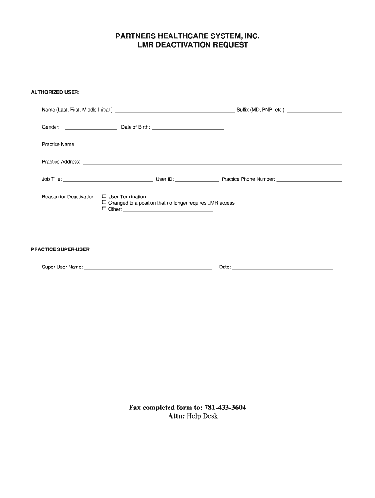 ... a position that no longer requires MR access. Other: PRACTICE SUPER-USER. Super-User Name: Date: Fax completed form to: 781-433-3604. Attn: Help Desk.https://lmr.partners.org/lmr/securelogin/docs/deactivationR