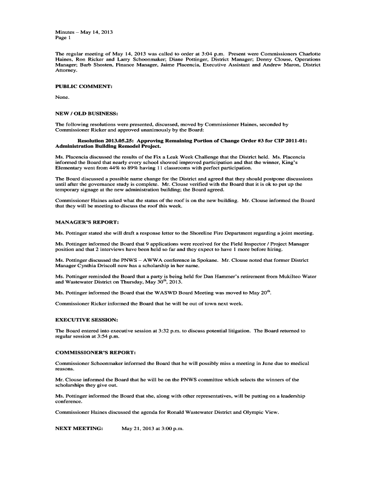 Minutes May 14, 2013, Page 1The regular meeting of May 14, 2013, was called to order at 3:04 p.m. Present were Commissioners Charlotte Haines, Ron Kicker and Larry Schooner; Diane Potting her, District