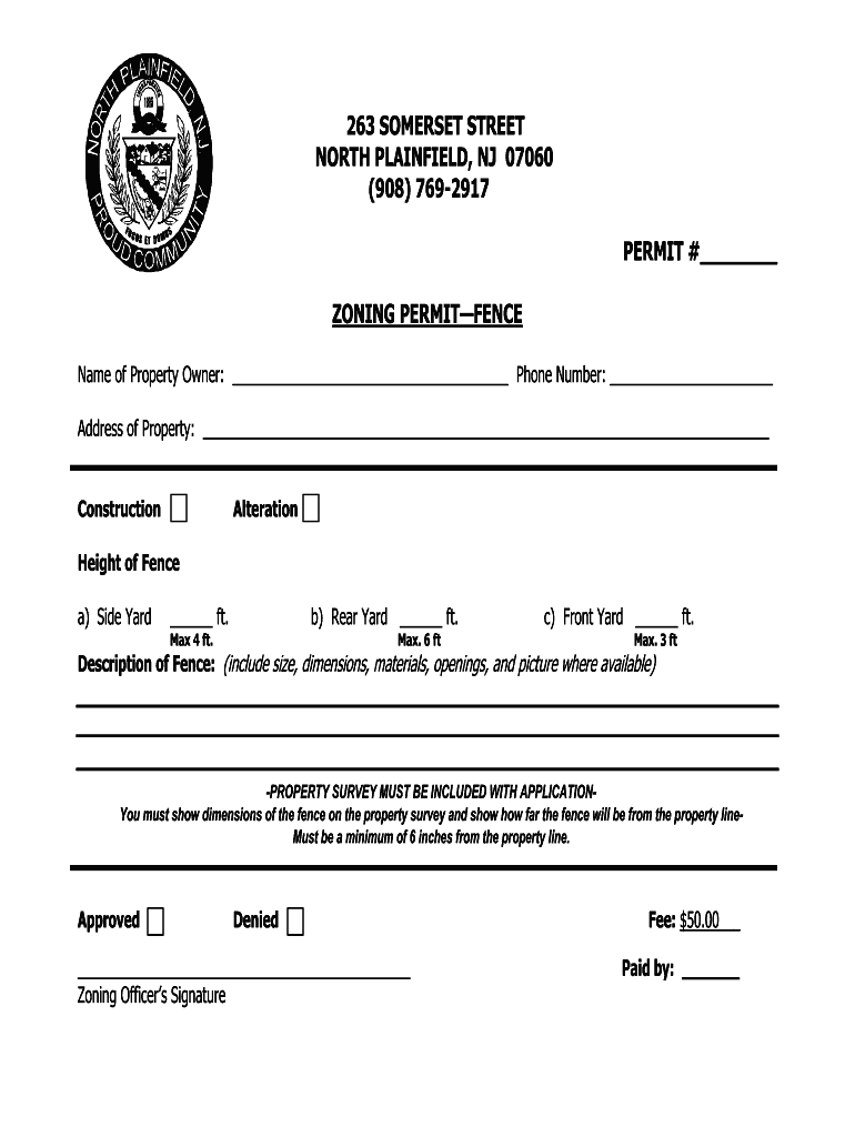 263 SOMERSET STREET NORTH PLAINFIELD, NJ 07060 (908) 7692917 PERMIT # ZONING PERSISTENCE Name of Property Owner: Phone Number: Address of Property: ConstructionAlterationHeight of Fence a) Side Yard