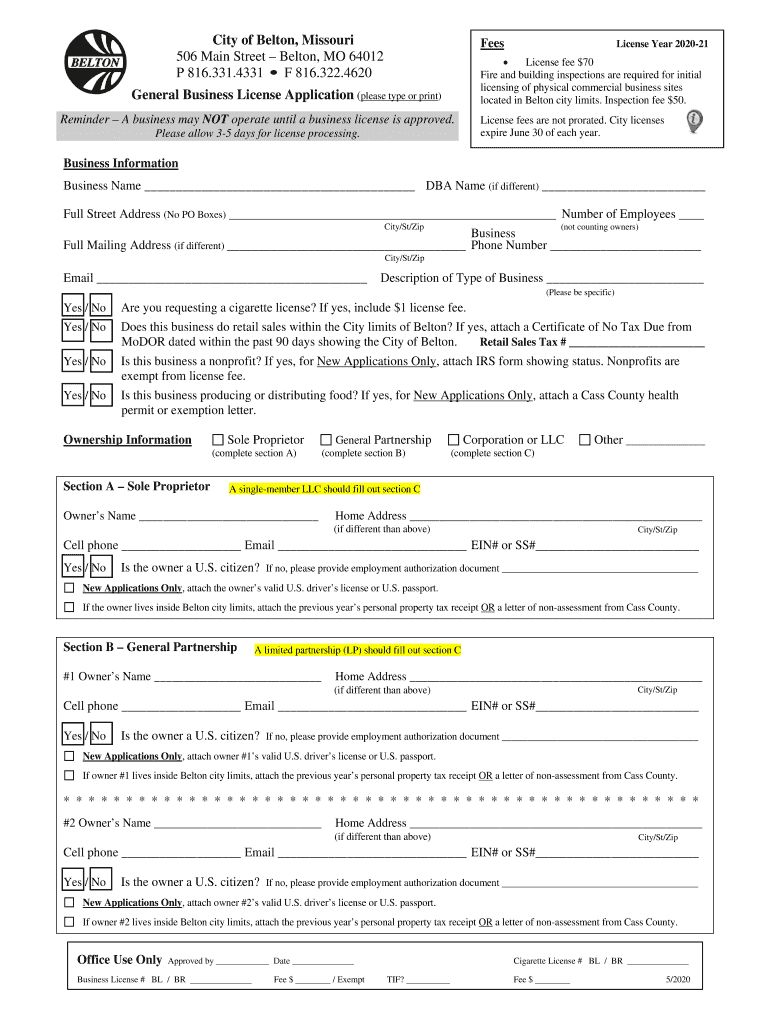 City of Belton, Missouri 506 Main Street Belton, MO 64012 P 816.331.4331 F 816.322.4620FeesLicense Year 202021 License fee $70 Fire and building inspections are required for initial licensing of physical