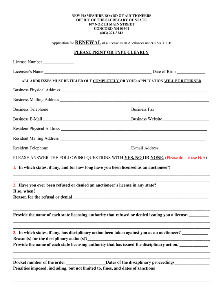 NEW HAMPSHIRE BOARD OF AUCTIONEERS OFFICE OF THE SECRETARY OF STATE 107 NORTH MAIN STREET CONCORD NH 03301 (603) 2713242 Application for RENEWAL of a license as an Auctioneer under RSA 311BPLEASE