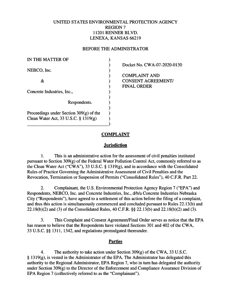UNITED STATES ENVIRONMENTAL PROTECTION AGENCY REGION 7 11201 RUNNER BLVD. LENEXA, KANSAS 66219 BEFORE THE ADMINISTRATOR IN THE MATTER OF NE BCO, Inc. & Concrete Industries, Inc., Respondents. Proceedings