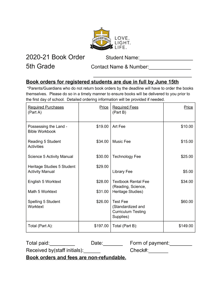 202021 Book Order 5th GradeStudent Name: Contact Name & Number: Book orders for registered students are due in full by June 15th *Parents/Guardians who do not return book orders by the deadline will
