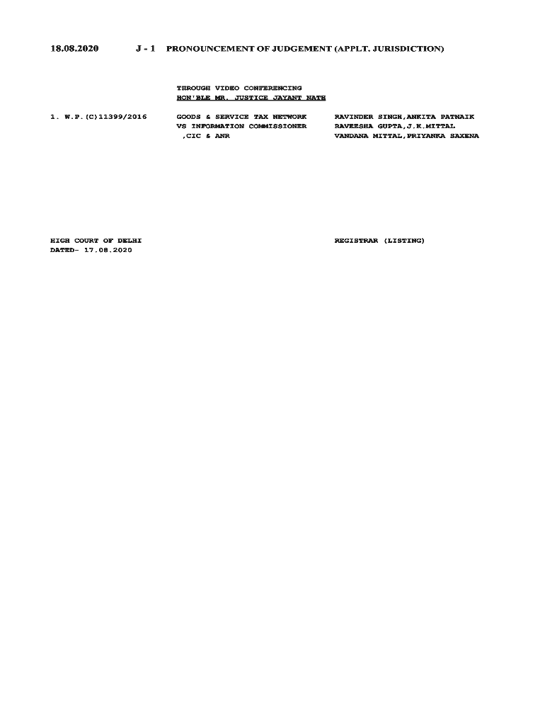 18.08.2020J1PRONOUNCEMENT OF JUDGEMENT (APPLY. JURISDICTION)THROUGH VIDEO CONFERENCING HON 'BLE MR. JUSTICE JAY ANT PATH 1. W.P.(C)11399/2016HIGH COURT OF DELHI DATED 17.08.2020GOODS & SERVICE TAX