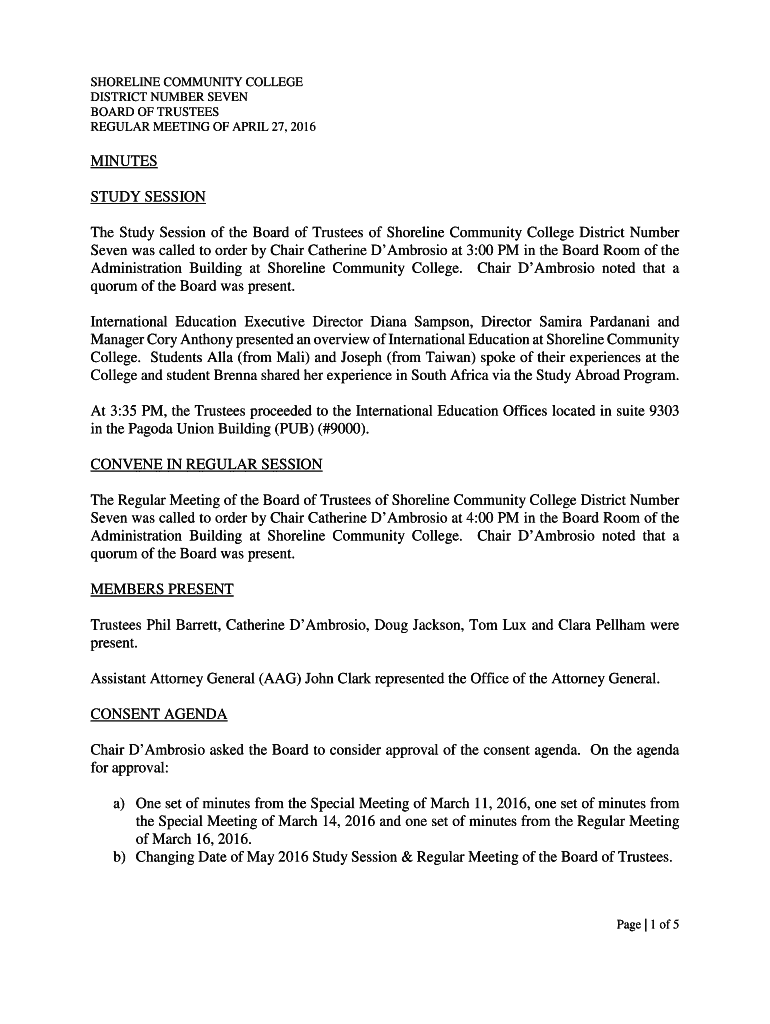 REGULAR MEETING OF APRIL 27, 2016MINUTES