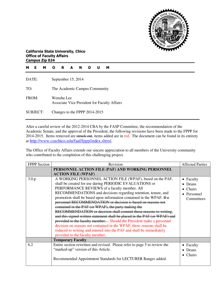 Associate Vice President for Faculty AffairsSUBJECT:Changes