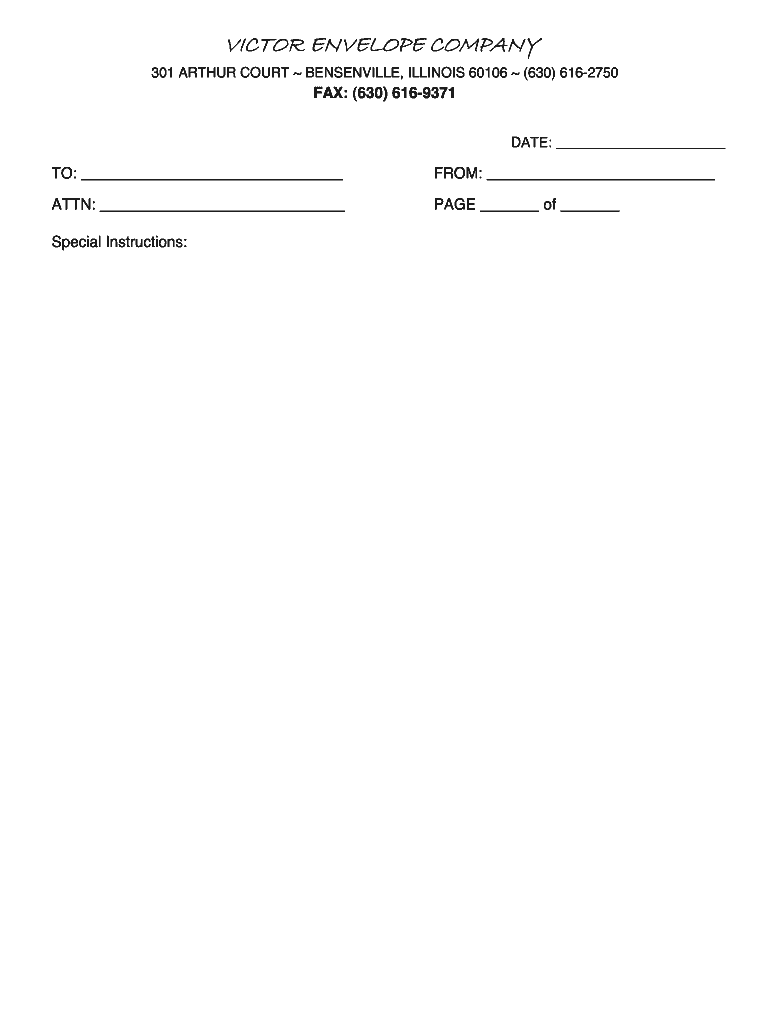 301 ARTHUR COURT BENTONVILLE, ILLINOIS 60106 (630) 6162750FAX: (630) 6169371 DATE: TO: FROM: ATTN: PAGE of Special Instructions:Victor Envelope Company Quote Form Fax to: 630.616.9371Attn: Salesperson