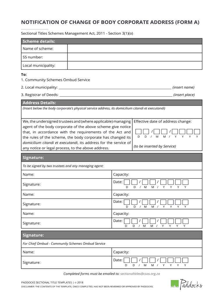 NOTIFICATION OF CHANGE OF BODY CORPORATE ADDRESS (FORM A) Sectional Titles Schemes Management Act, 2011 Section 3(1)(o)Scheme details: Name of scheme: SS number: Local municipality: To: 1. Community