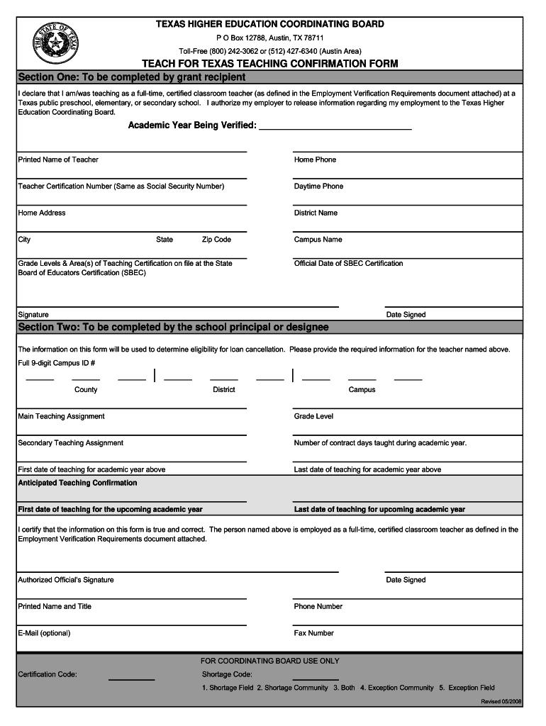 Toll-free (800) 2423062 or (512) 4276340 (Austin Area)TEACH FOR TEXAS TEACHING CONFIRMATION FORM