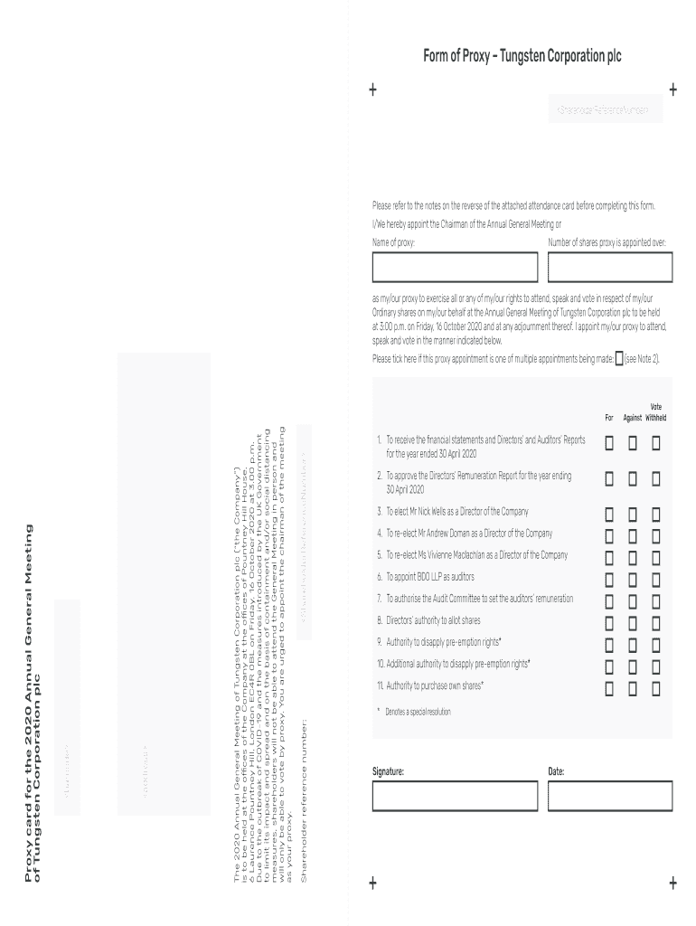 Form of Proxy Tungsten Corporation plc ShareholderReferenceNumberPlease refer to the notes on the reverse of the attached attendance card before completing this form. I/We hereby appoint the Chairman