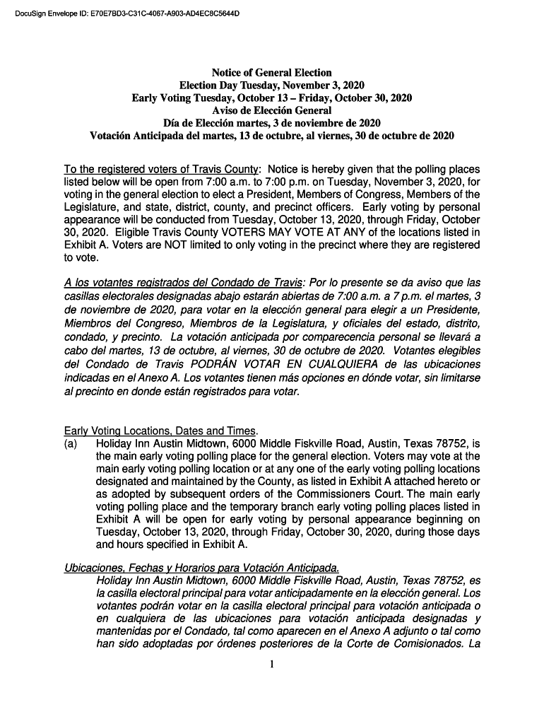 DocuSign Envelope ID: E70E7BD3C31C4067A903AD4EC8C5644DNotice of General Election Day Tuesday, November 3, 2020, Early Voting Tuesday, October 13 Friday, October 30, 2020, Avis ode Election General