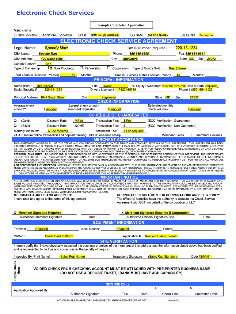 The Electronic Check Service Agreement must be signed by the merchant, an authorized merchant, an inspector, and an authorized officer of GETI.